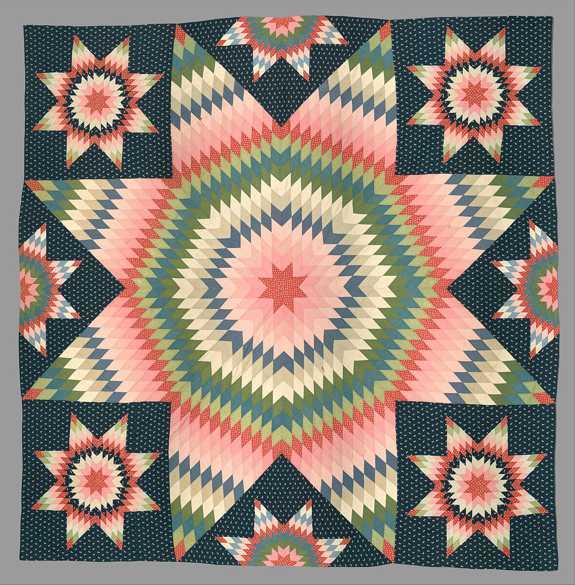 This Quilt Pattern Features A Large Star With Eight Pointed Points That Radiate Outward To Form A Starburst Medallion.